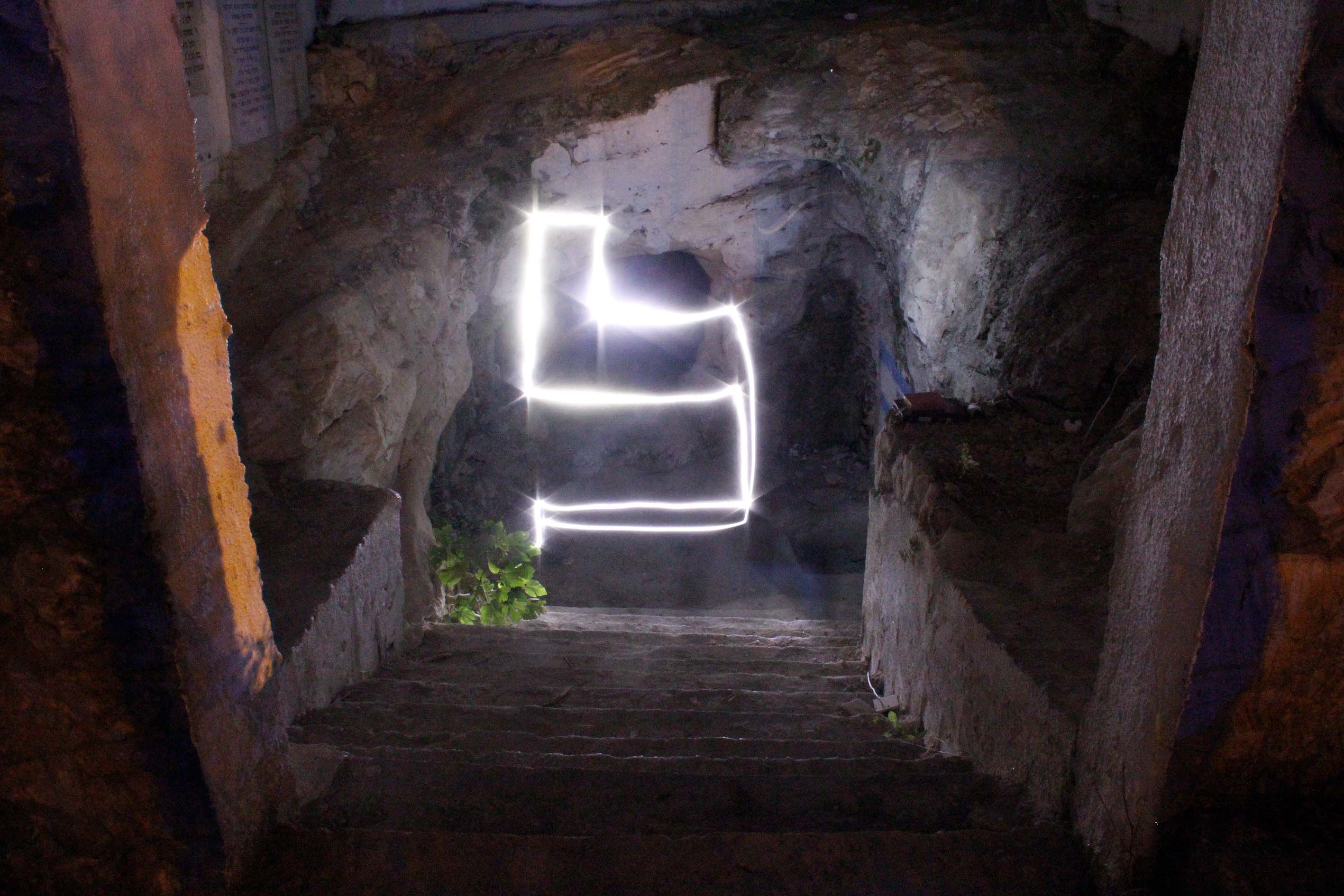 שלושת התצלומים הללו בהדפסת סיבכרון (אנלוגי) צולמו בקברי צדיקים בגליל בלילה, על-ידי העמדת המצלמה לזמן ממושך וצילום בחשיפה ארוכה הם לוכדים אותיות עבריות שנכתבו עם פנס באוויר; כאילו האותיות הצפות בבהירות קמו לתחייה מהקברים. בניית האותיות באור כמחווה גופנית פרפורמטיבית שבאמצעותה הפכתי לבלתי נראה, כששובל התנועה נרשם. צורתן ומבניהן המובהקות של האותיות נכנסות לדיאלוג עם האדריכלות של הקברים-אתרים- ציונים-אנדרטאות. תליית התצלומים יוצרת רצף דמיוני, ויחד הם משרשרים את המילה מפל.